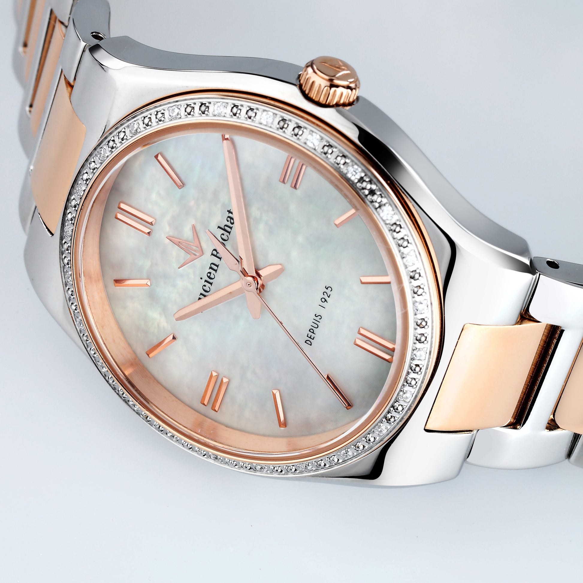 Let yourself be seduced by the Lucien Rochat Avenue Women's Watch R0453122507 , a masterpiece of design that captures feminine elegance with a touch of discreet luxury, ideal for those seeking a refined and distinctive timepiece . Part of the sought-after Avenue collection, this watch features a stunning two-tone silver and rose gold steel case and bracelet, creating a warm and modern contrast. The true highlight is the exclusive bezel, embellished with select natural diamonds (H/I) that add an unmistakable sparkle. Powered by a reliable quartz movement and protected by a sturdy scratch-resistant sapphire crystal , this Lucien Rochat diamond-set watch is the perfect accessory to elevate every look, from business to evening wear. Purchase the R0453122507 and wear the most sparkling Swiss elegance.